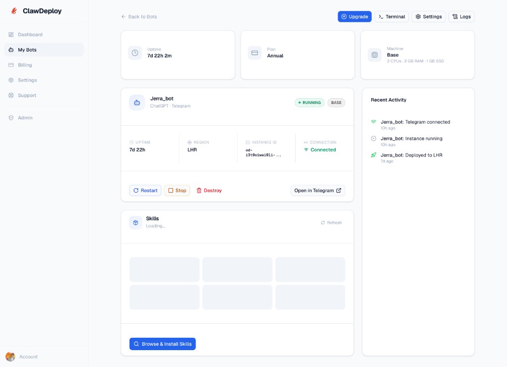 The dashboard gives you everything you need at a glance: uptime, region, connection status, installed skills, and recent activity. No SSH required. No log files to tail. Just a clean interface that tells you your bot is running and your users are happy.